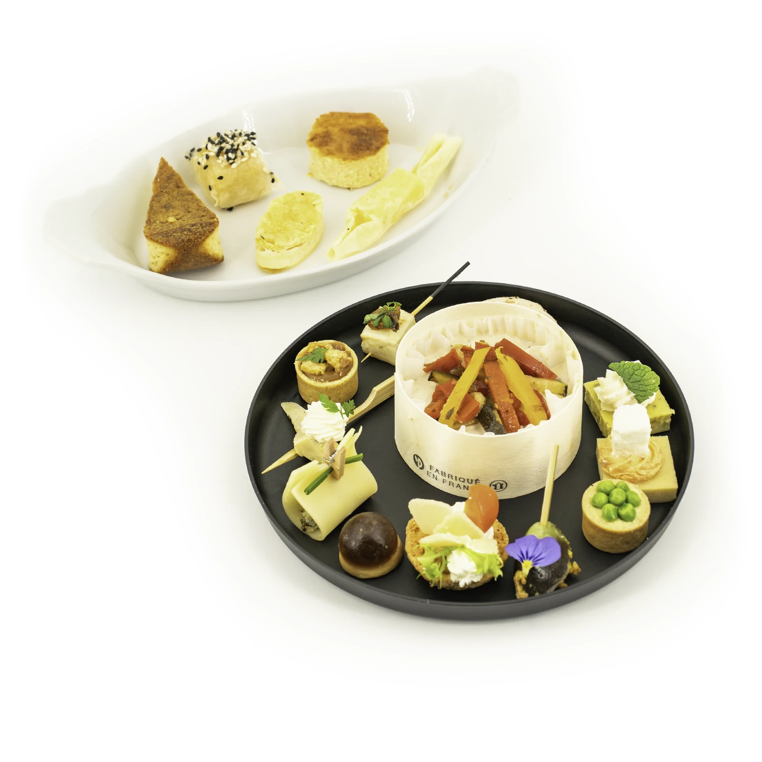 Toutes nos pièces apéritives et entrées froides sont conditionnées en format jetable réutilisable et recyclable.