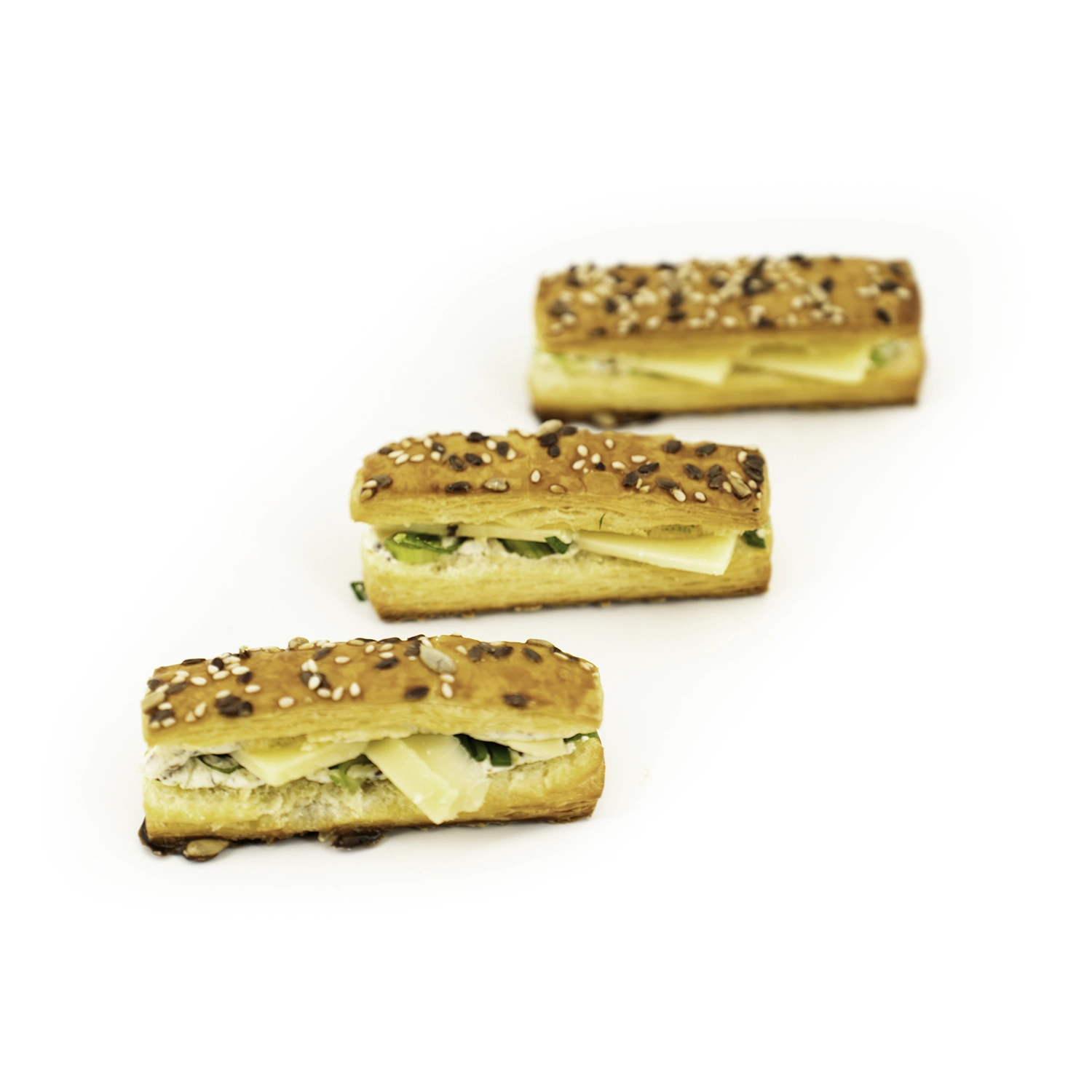 Le Crousty Feuilleté – Comté, moutarde et cébette est composé de deux fines couches de feuilletage doré, entre lesquelles le comté se mêle à une préparation onctueuse à base de crème épaisse et de moutarde de Meaux, relevée par de la cébette et un topping aux graines.