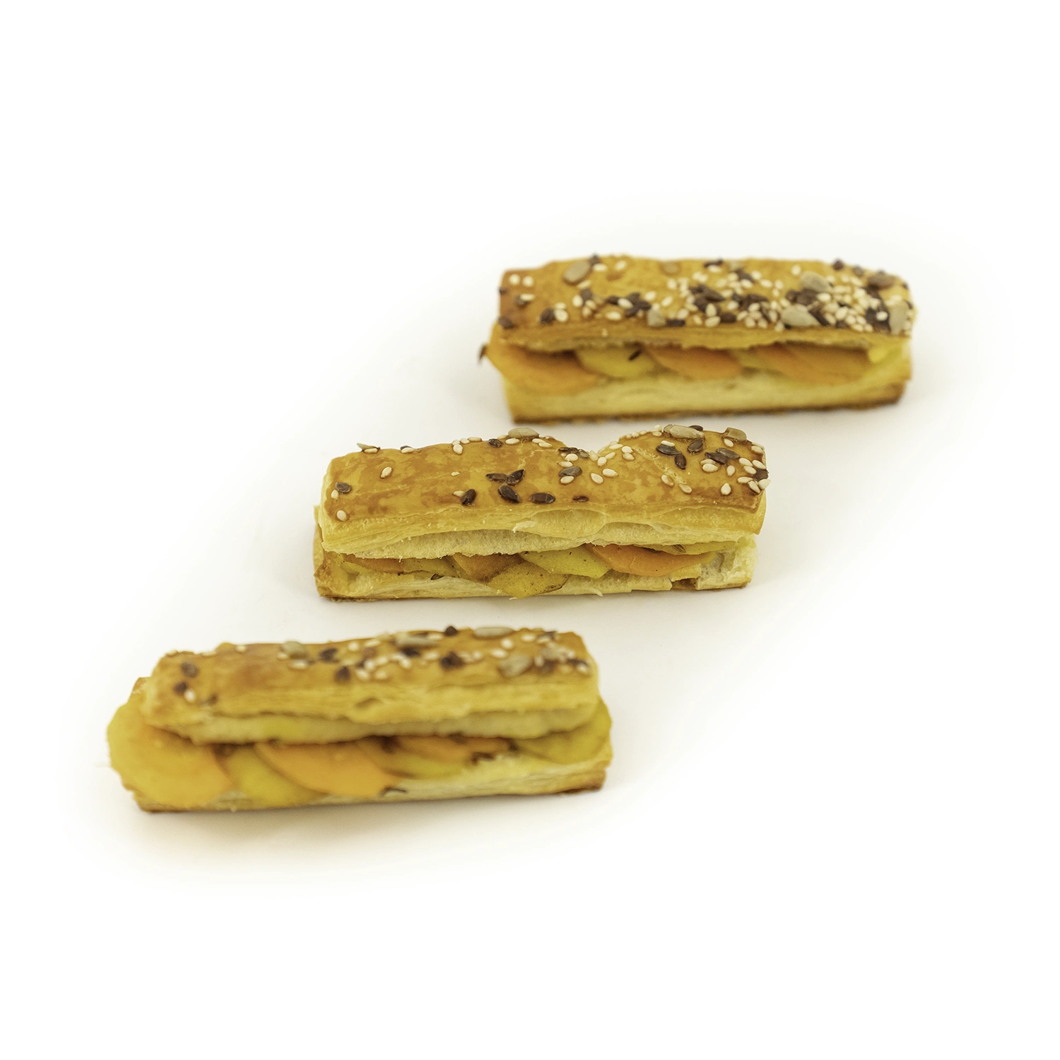 Le Crousty feuilleté – Houmous carotte cumin se compose de deux fines couches de feuilletage doré, garnies de houmous, de carottes au cumin et d’un filet d’huile d’olive, le tout complété par un topping aux graines.