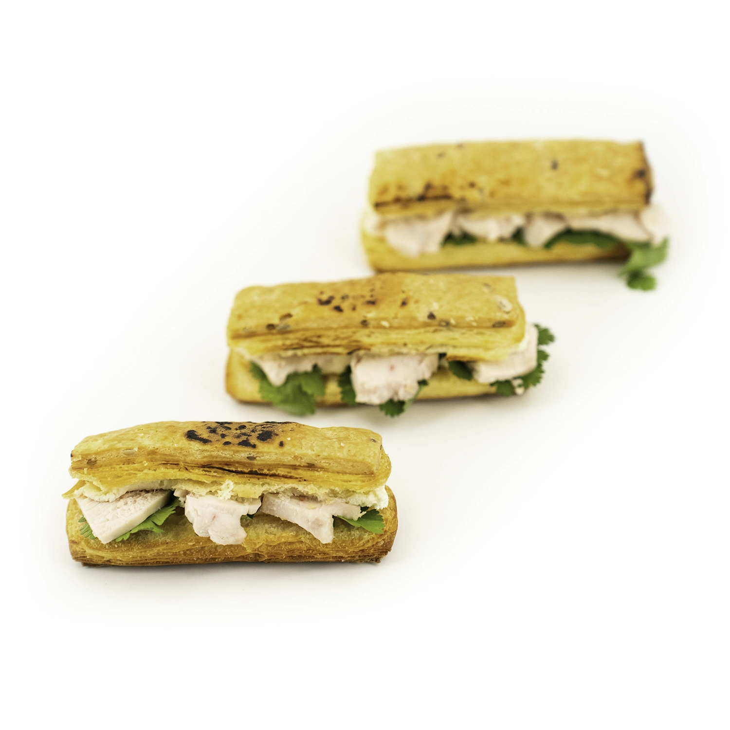Le Crousty Feuilleté – Poulet crème de parmesan est composé de deux fines couches de feuilletage doré, entre lesquelles le poulet assaisonné s’associe à une crème de parmesan, relevée par quelques feuilles de coriandre.