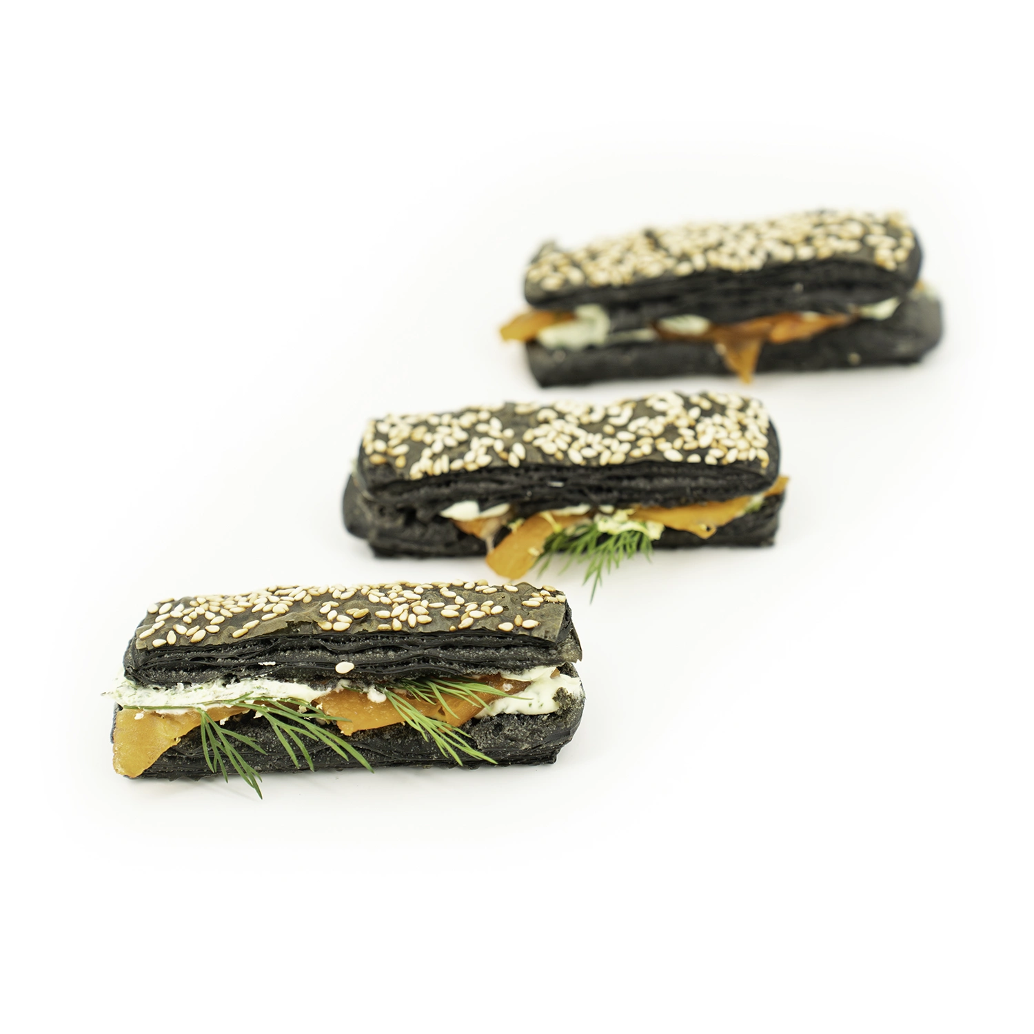 Le Crousty Feuilleté – Truite fumée, citron vert et charbon végétal est composé de deux fines couches de feuilletage croustillant, entre lesquelles la truite fumée s’associe à une base de Madame Loïk relevée de zestes de citron vert.