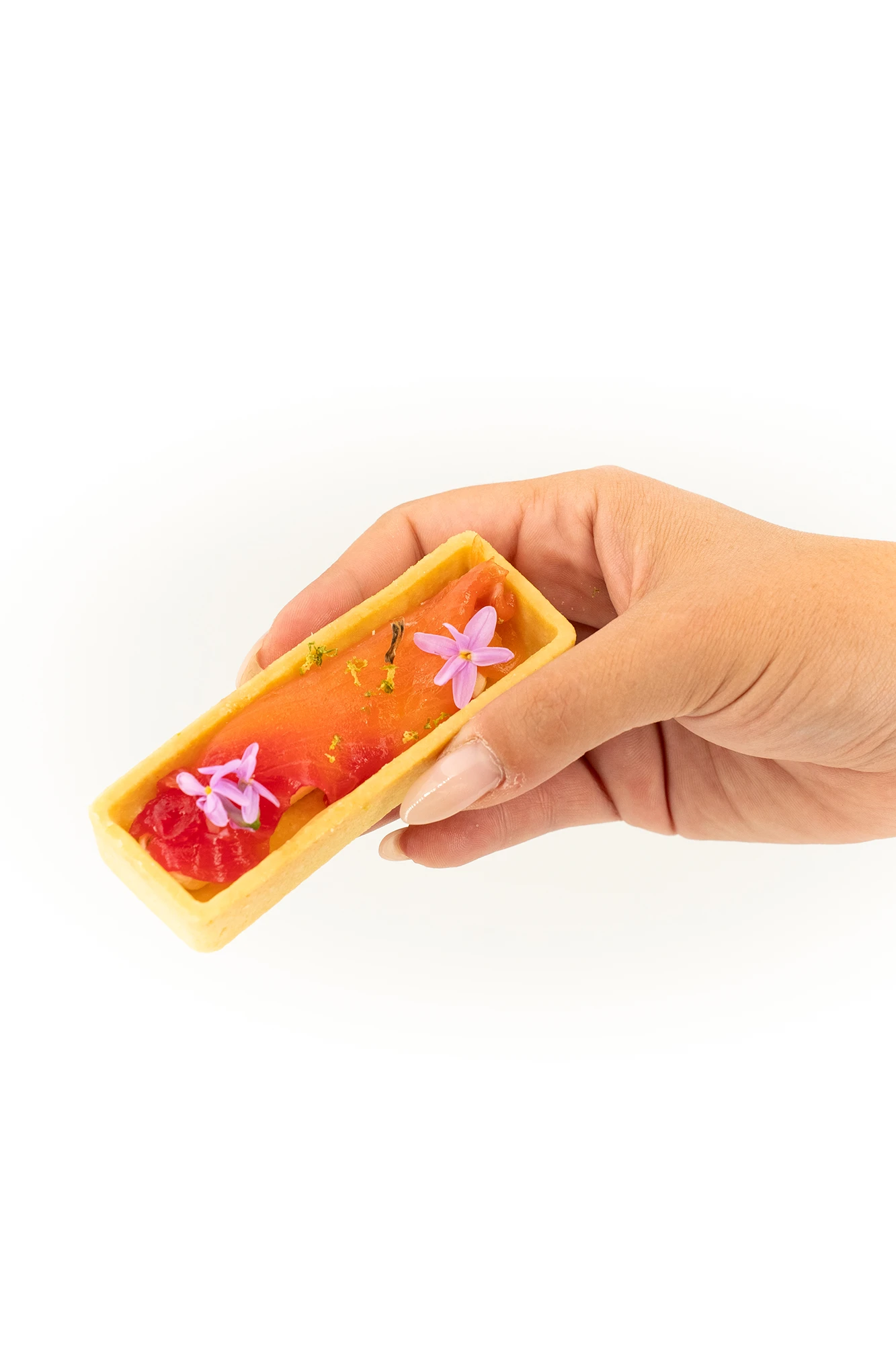 Le Danica collection Food Garden, une subtile pâte brisée croustillante, garnie de saumon gravlax infusé à la betterave. Parfumé de zeste de citron vert, le tout repose sur un lit de crème onctueuse et de moutarde douce, pour une alliance parfaite entre fraîcheur, douceur et acidité. Quelques touches herbacées viennent souligner l’équilibre des saveurs, tandis que la pâte fine apporte une texture légère et fondante en bouche.