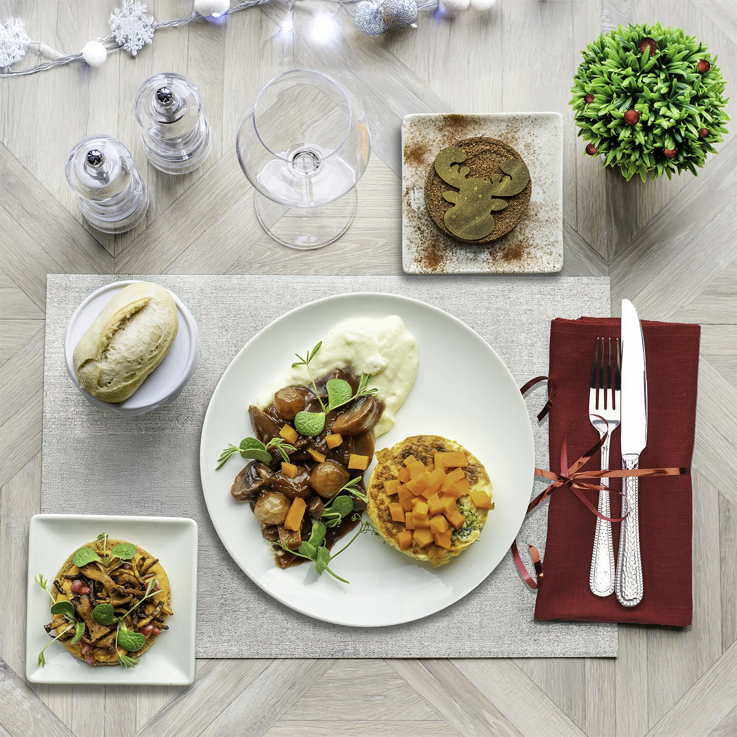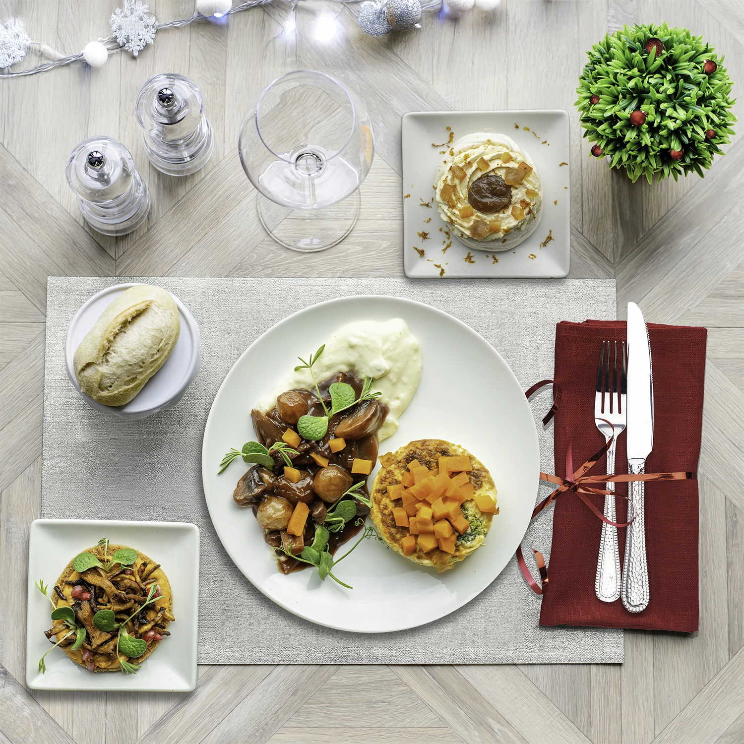 Les photos présentées illustrent les recettes réelles dressées sur assiette, mais le contenant livré est celui d’un plateau repas, avec un format d’un plateau couvercle inclus : 370 l x 270 L 64 H mm.
