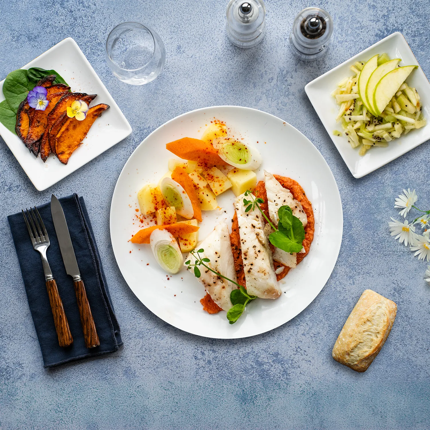 Une gamme intermédiaire complète “Entrée, Plat, Fromage, Dessert” qui marie élégance et gourmandise pour un déjeuner à la fois sophistiqué et décontracté.