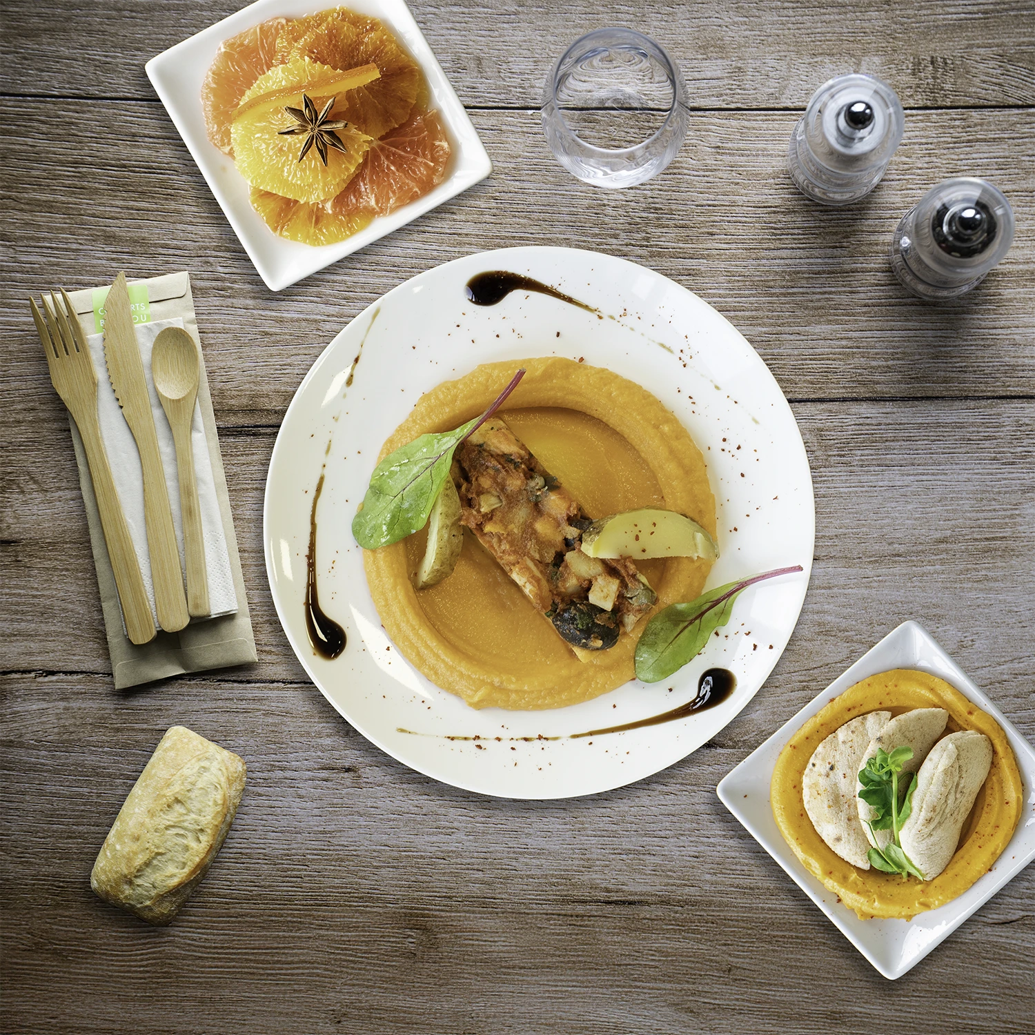 Livré avec des couverts en bambou réutilisables, un verre en pulpe de bambou et une serviette en papier.
