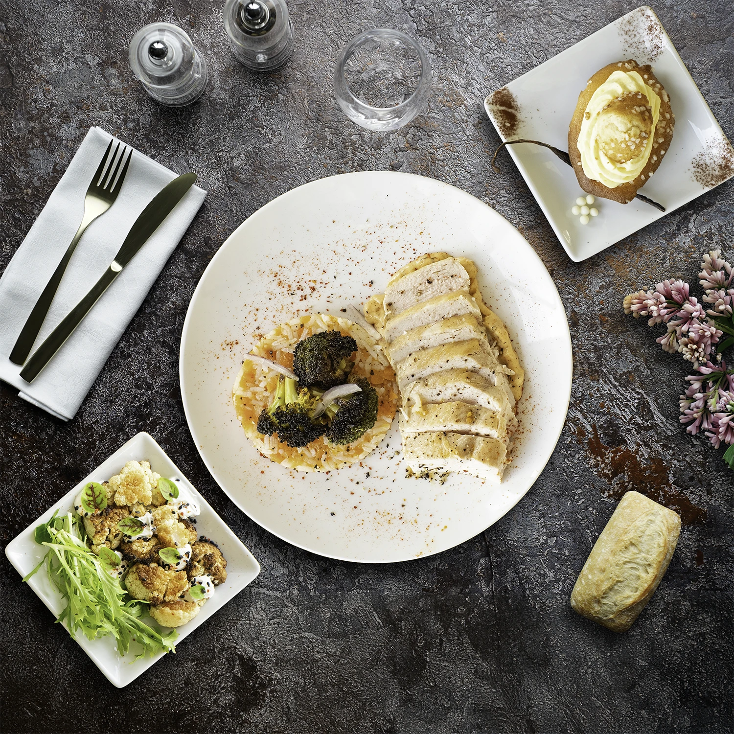 • Chou-fleur grillé aux épices zaatar et yaourt au sésame (Le zaatar est composé de thym, d’origan, de sumac et de graines de sésame)