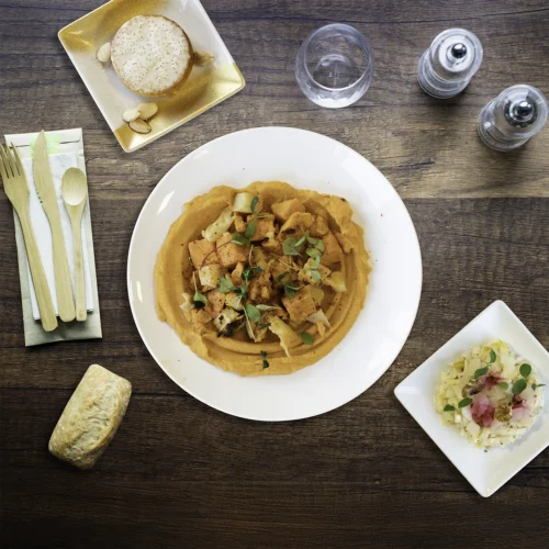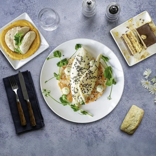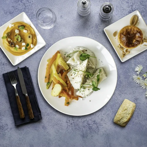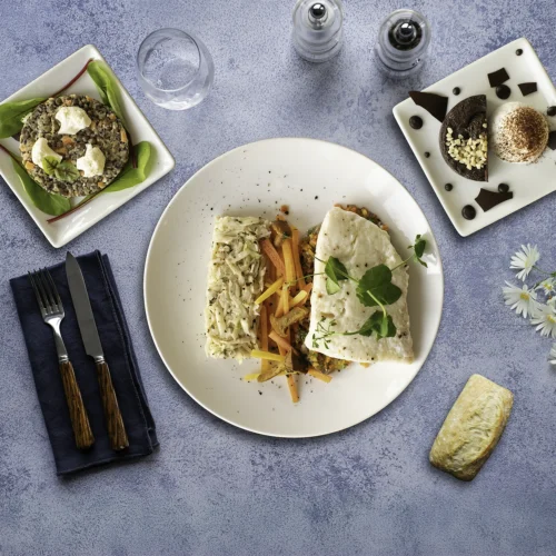 22 choix culinaires en 3 gammes, avec une offre de plateaux repas variée : viande, poisson, végétarien, vegan, sans gluten, sans lactose :